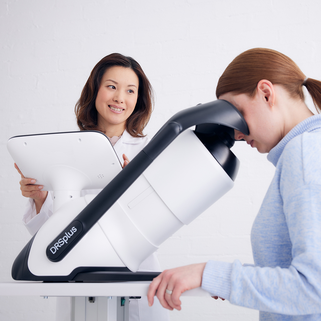 The fast and fully automated iCare DRSplus permits imaging through pupils as small as 2.5 mm, without need of dilation, ensuring a comfortable patient experience. This easy to use device offers the advantage of quick examination time and helps speed up workflow at clinics.